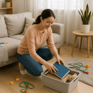 - ラベルシール:分類を明確にし、再度散らからない仕組みづくりに役立ちます。色別ラベルを使うと、家族全員がどこに何を戻すかを一目で理解できます。