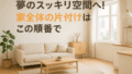 - 寝室:ベッド周りの衣類・本を整理。不要な服は紙袋に入れておくと、後日まとめて処分しやすいです。