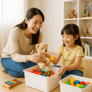 片付けを“義務”ではなく“遊び”に変えることで、子どもは自発的に動きやすくなります。タイマーを使って「3分片付けゲーム」にしたり、好きな音楽を流してテンポよく片付けるのもおすすめです。兄弟や家族で競争形式にするとさらに盛り上がります。「誰が一番早くブロックを片付けられるかな?」などと声をかけると、自然と楽しみながら取り組めます。カラフルな収納ボックスを使って「色別に片付けよう!」とルールを作ったり、片付けが終わった後にシールを貼る「片付けカレンダー」を活用するのも効果的です。また、季節ごとに収納場所を変えたり、新しいアイテムを追加して“変化”を感じさせることで、飽きずに続けやすくなります。楽しい雰囲気を作ることで、片付けが「やらなければならないこと」から「やりたいこと」へと変わり、子どもの主体性を伸ばすきっかけになります。